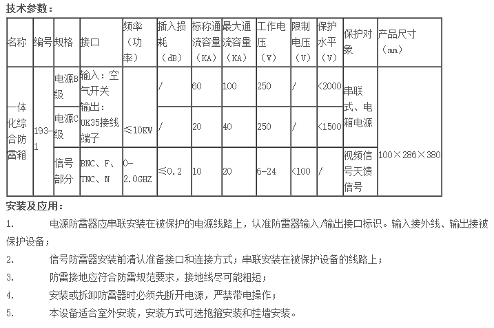 1.一體化綜合防雷箱電源防護(hù)、信號防護(hù)及等電位接地于一體;