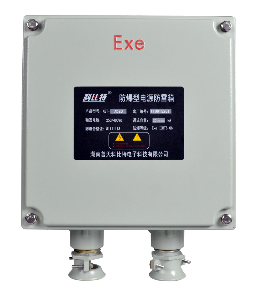 防爆型電源防雷箱的箱體是采用符合GB3836.3-2010《爆炸性環(huán)境 第3部分:由增安型“e”保護(hù)的設(shè)備》標(biāo)準(zhǔn)要求的防爆箱,防爆標(biāo)志是:Ex eⅡ T6 Gb/DIP A21 TA T6。防爆箱內(nèi)部安裝的是按照GB18802.1-2011《低壓電涌保護(hù)器(SPD) 第1部分 低壓配電系統(tǒng)的保護(hù)器性能要求和試驗(yàn)方法》標(biāo)準(zhǔn)要求生產(chǎn)的電源防雷模塊,并內(nèi)置了斷路器,其中KBT-AD系列配置的電源防雷模塊為I級(jí)試驗(yàn)(T1)電涌保護(hù)器,用于第一級(jí)雷電防護(hù),KBT-BD和KBT-CD系列配置的電源防雷模塊為II級(jí)試驗(yàn)(T2)電涌保護(hù)器,分別用于第二級(jí)和第三級(jí)雷電防護(hù)。適合各種電網(wǎng)制式的電源系統(tǒng),防止雷擊產(chǎn)生的脈沖浪涌及瞬間過電壓對(duì)用電設(shè)備造成損害。