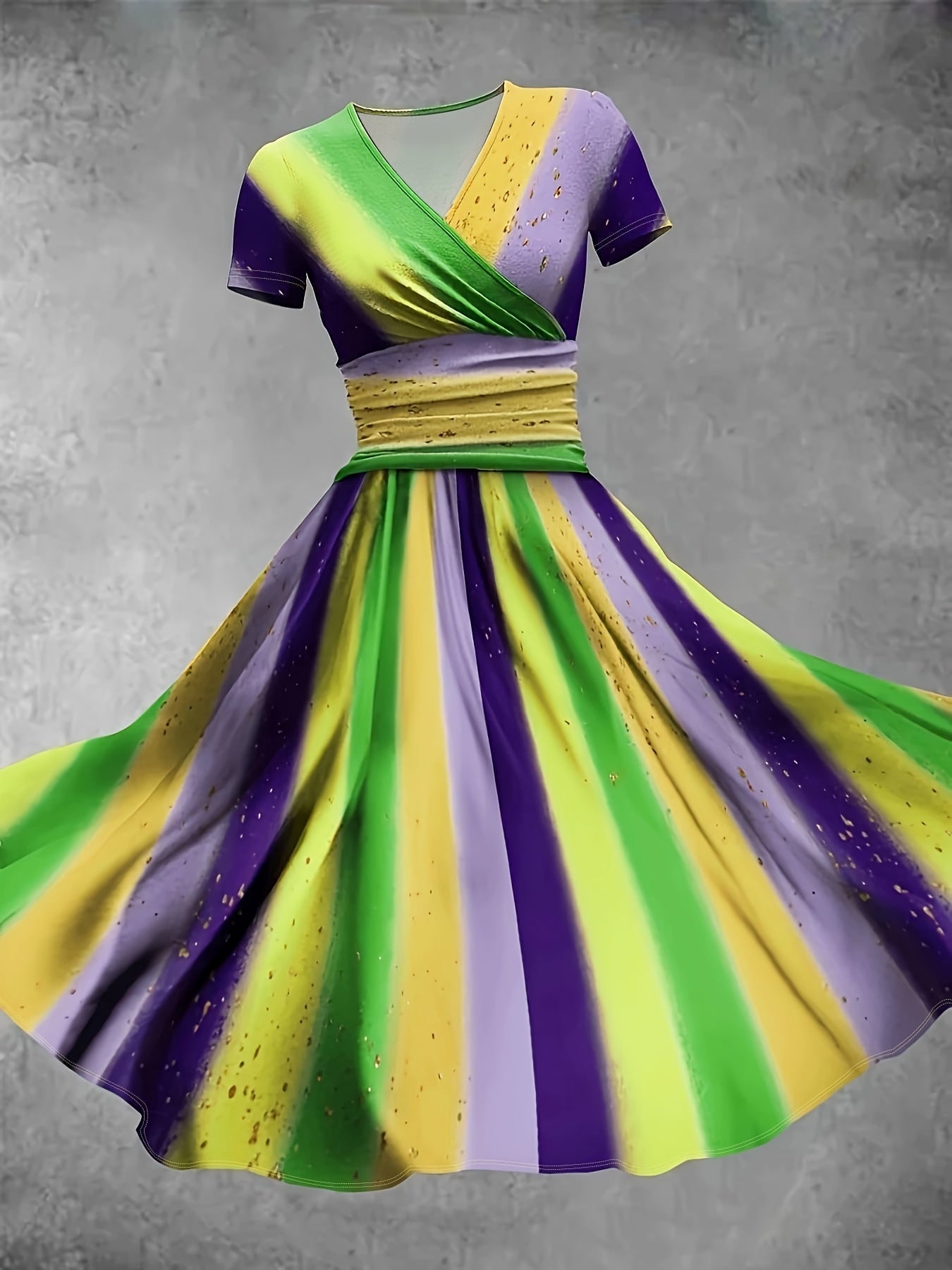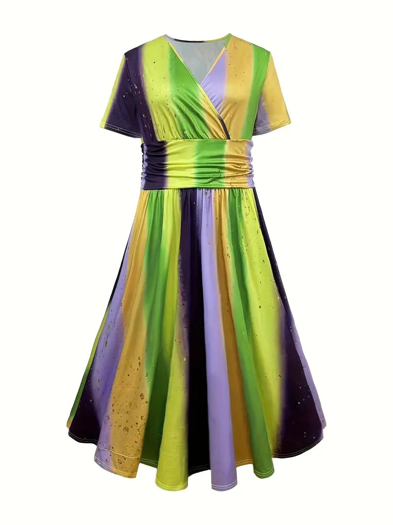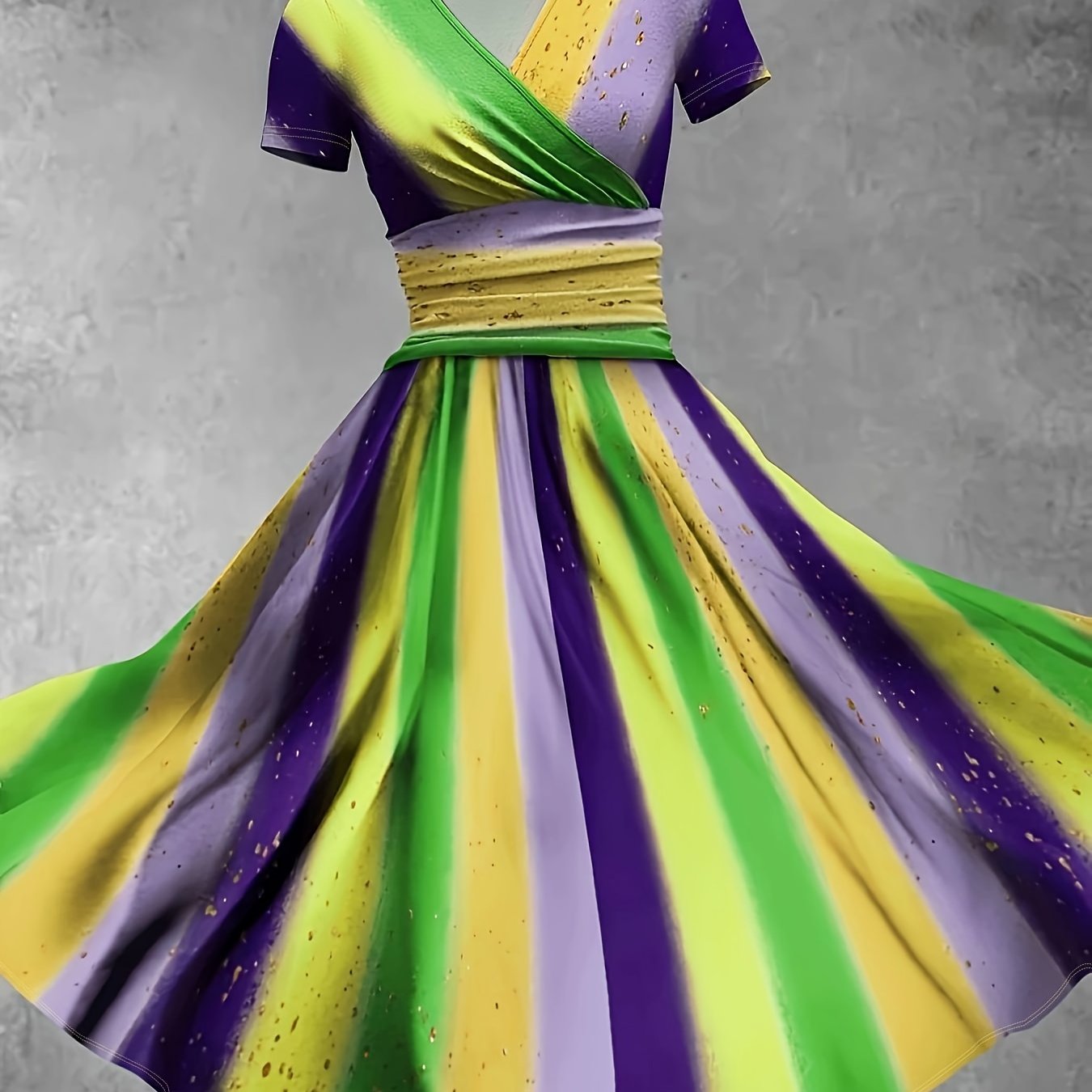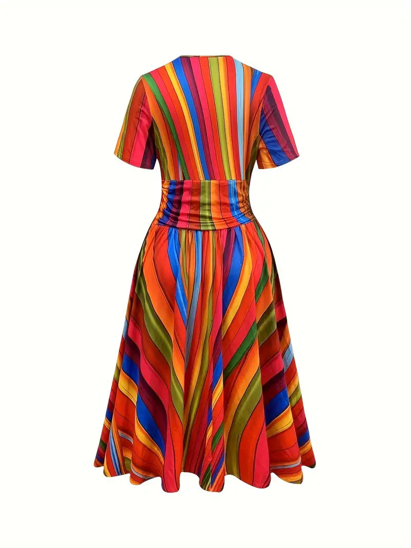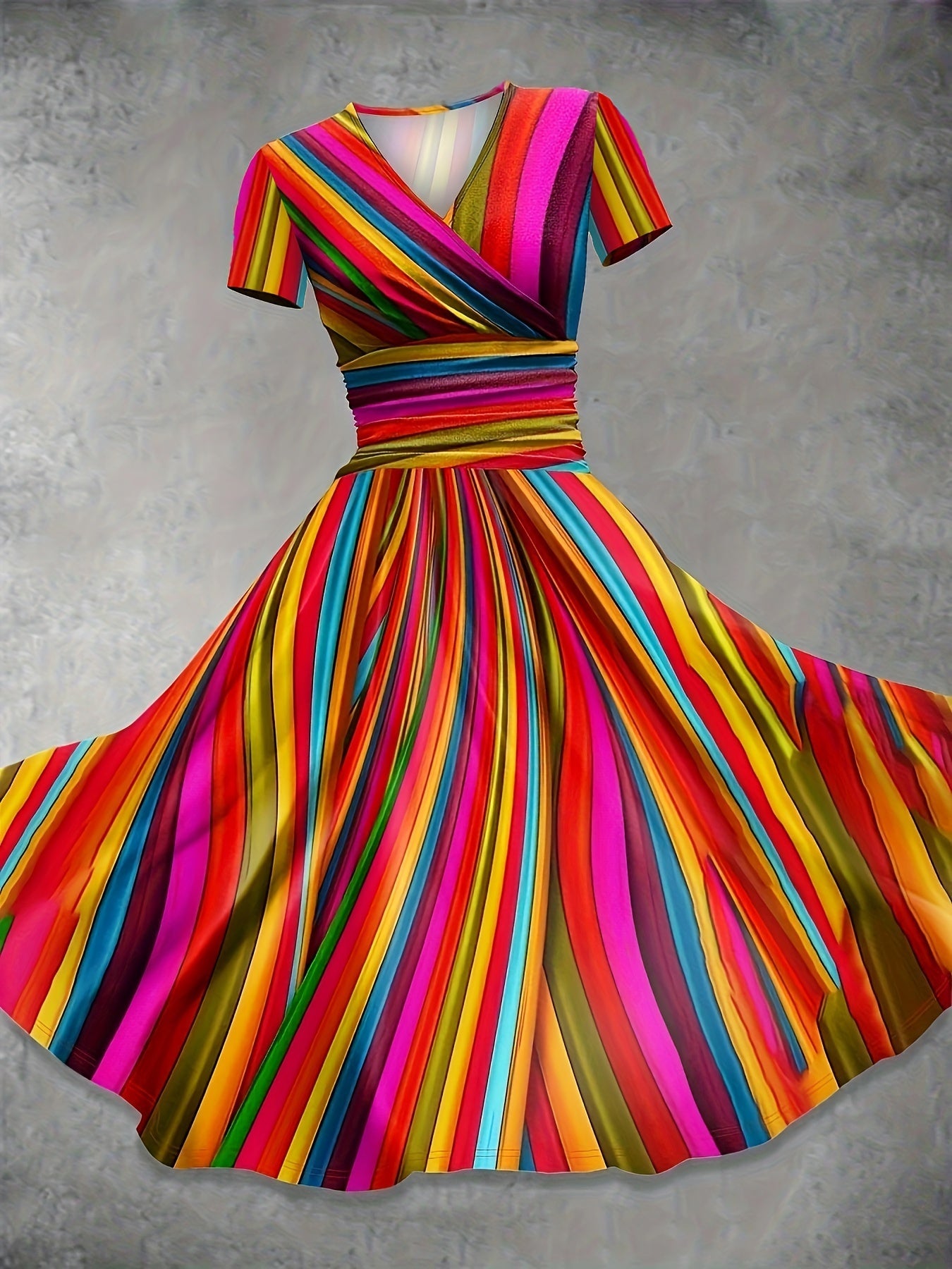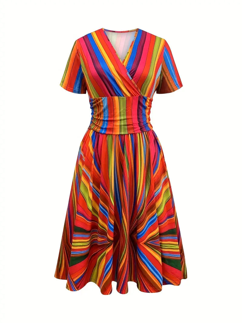 • Chic Colorblock Design – The striped print and V-neckline create a sleek, vertical line that elongates your figure and adds a modern twist.